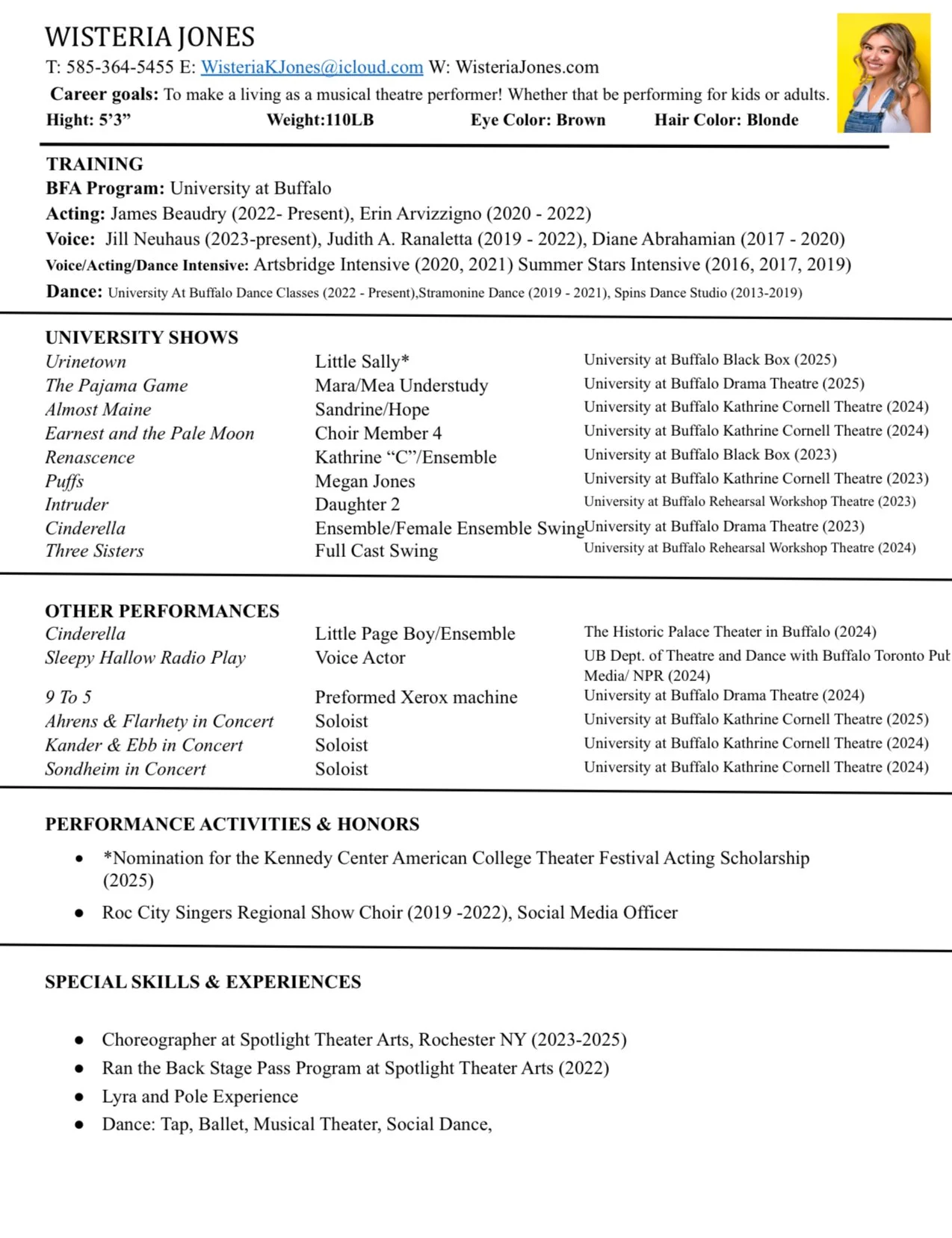 Hi! My name is Wisteria Jones(she/her). I’m a senior, musical theater major, and education minor at the University at Buffalo. I love to perform and have been consistently performing in musicals since the seventh grade. Some of my favorite roles include Little Sally from Urinetown and Logainne Schwartzandgrubenierre from Spelling Bee. When I’m not at rehearsal or practicing, you can find me giving tours on the University at Buffalo campus or being an active member of the Alpha Sigma Tau sorority. Over the summers, I also choreograph at a Rochester summer camp. That have camps for grades K-12. I love working in a team and getting to meet new people, and I think every opportunity is an opportunity to learn something new.